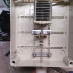 Above are the internals and the rear. I designed it so I could unscrew the top spreaders from the case to transport. There’s enough room in the box for a gear reduction motor for remote operation in the future. N type connectors on the sides, are soldered to the outside shield from some RG8 coax(center insulator and conductor was remove to make more of a braid).